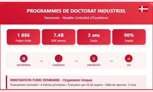 Le Danemark s'est forgé une réputation d'excellence dans la collaboration université-industrie grâce à son Programme de Doctorat Industriel (Erhvervsph.d. en danois), administré de manière centralisée par Innovation Fund Denmark. Ce système unique, établi depuis 1971 et perfectionné en 1988, représente aujourd'hui l'un des modèles les plus aboutis de formation doctorale orientée vers l'innovation et la création de valeur économique.